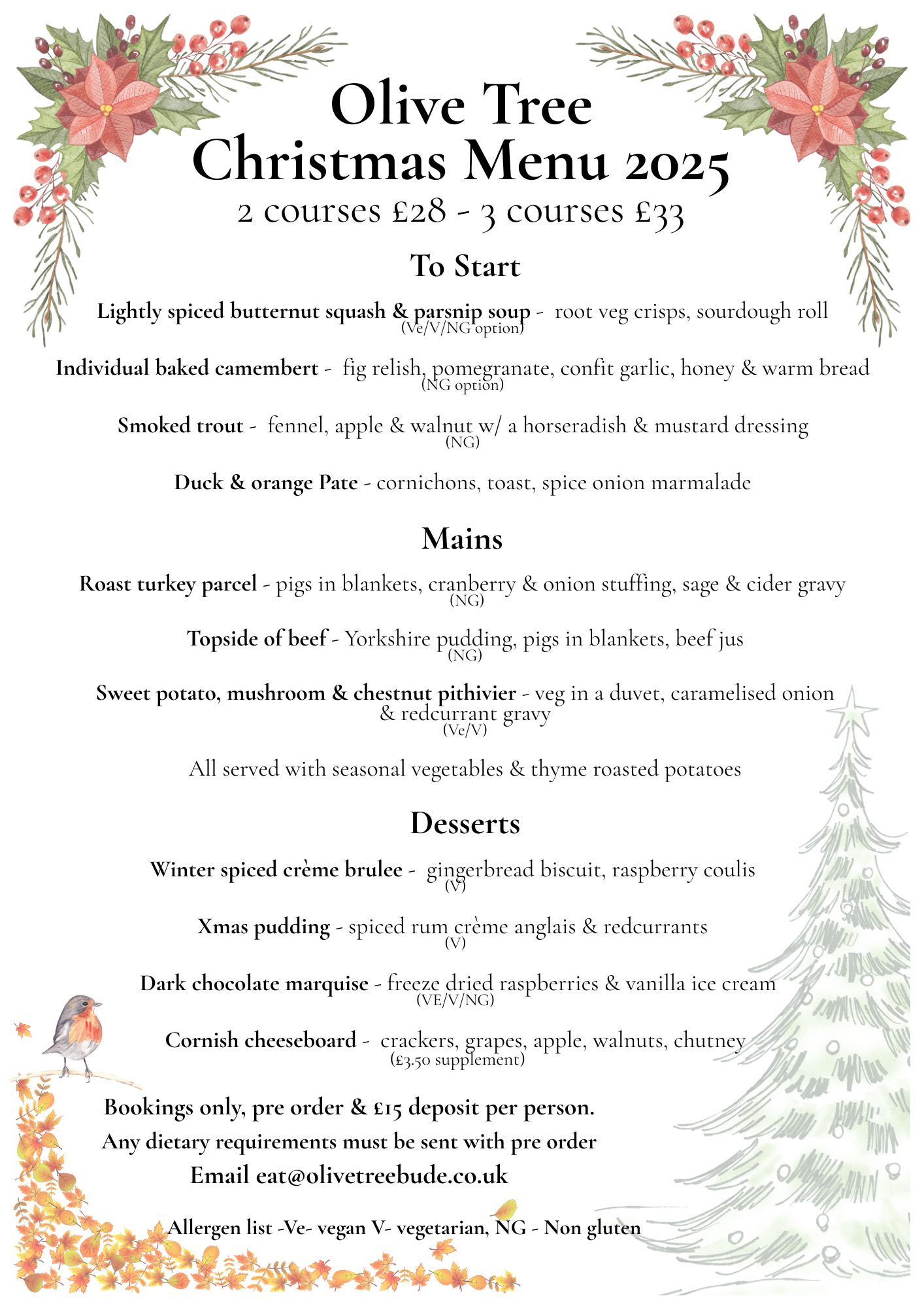 Welcome! FOOD MENUS BOOK A TABLE Christmas menu Available now!! CHRISTMAS MENU Normal opening hoursMonday 10-5pmTuesday 10-5pmWednesday 10-5pmThursday 10-5pmFriday 10-10pmSaturday 10-10pmSunday 10-5pmFood Service HoursSunday – Thursday10am till 11.45am for Breakfast12pm – 4pm LunchFriday -SaturdayAs above with food continuing through till 8 FACILITIES & ACCESSIBILITY *please note* we are only dog friendly outside, we do not allow dogs in the restaurant unless they are a service dog with their badges Some snaps Restaurant Guru 2025Best outdoor seatingOlive Tree